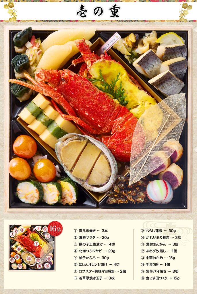 華やぎを担うロブスター黄味マヨ焼きの満足感、数の子土佐漬けの小気味よい食感。重箱を開けるたびに「次はこれ」と会話が弾む設計です。特別仕様の桐箱は卓上の雰囲気まで上質に整え、贈り物にもふさわしい風格。