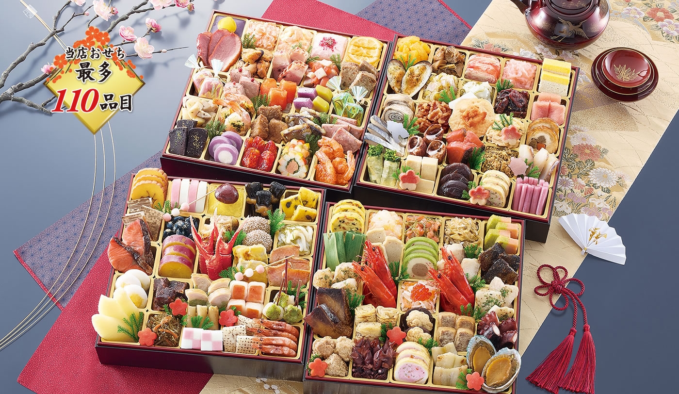 「花びし」監修100仕切りおせち「百彩」四段重 「百彩」は、8.5寸の特大四段に“100仕切り・全110品目”を詰め込んだ、多世代で楽しめる和洋折衷のおせちです。 祝い肴から洋のオードブル、甘味まで幅広く、例えば「金箔黒豆」「数の子醤油漬け」の晴れやか...