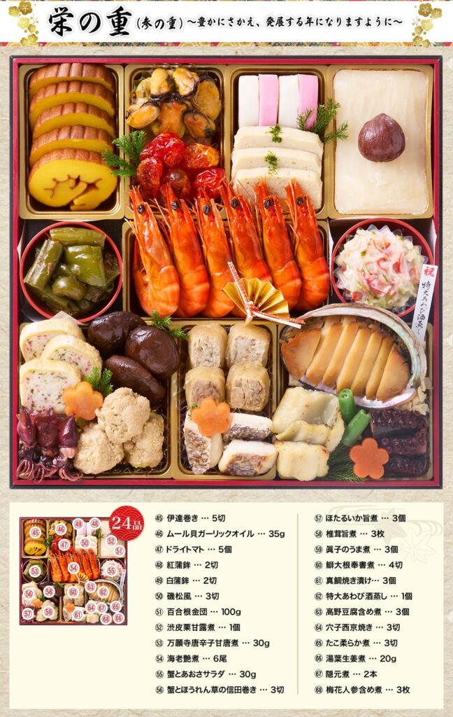 お重の内容 | 和風中心、特大三段重、68品目(約5〜6人前) |