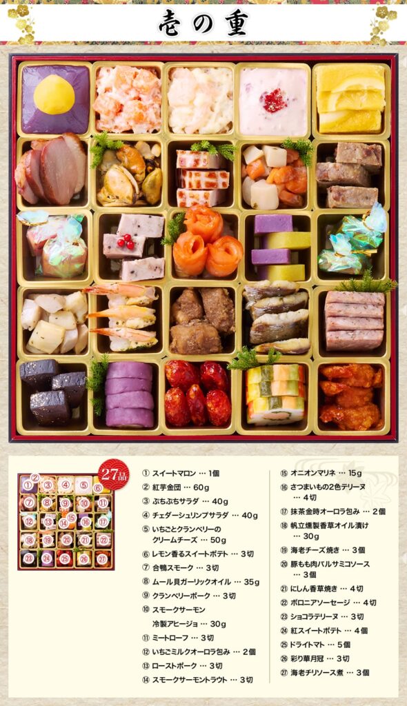• 100仕切り・全110品目が盛り込まれ、多彩な料理を“少量多種”で楽しめ、家族それぞれの好みに合う一品が見つかる構成。