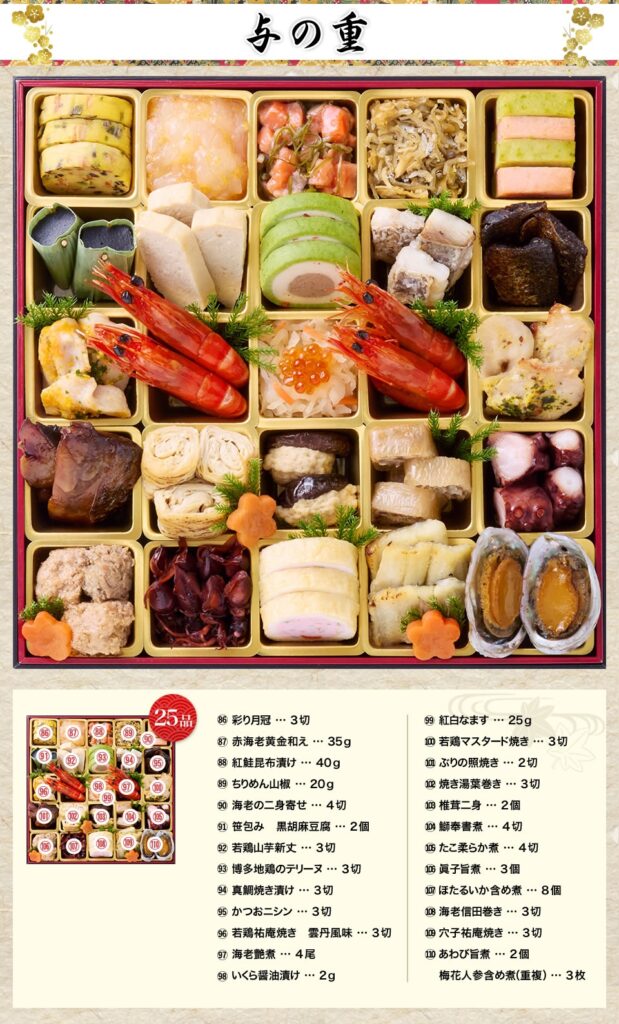 ここでは「百彩」四段重の各お重の中身と実際に購入した方の口コミを紹介します。
