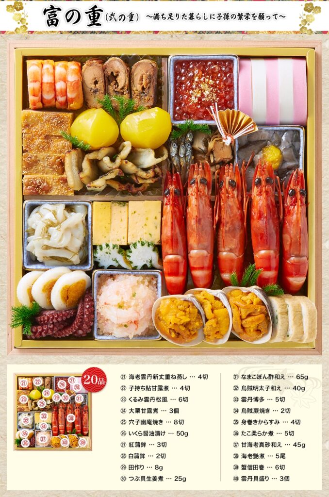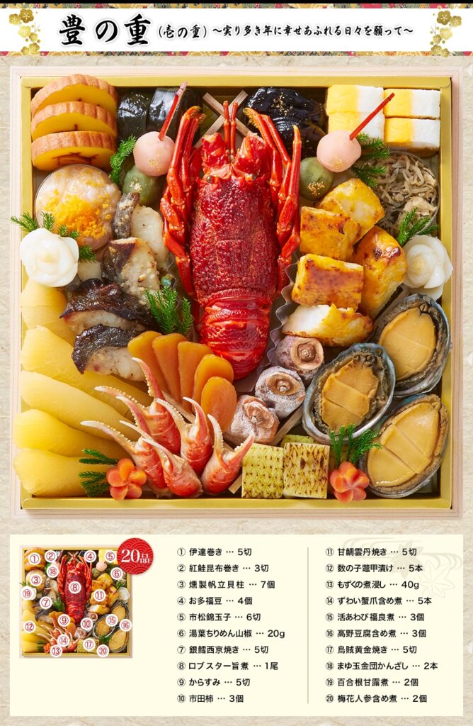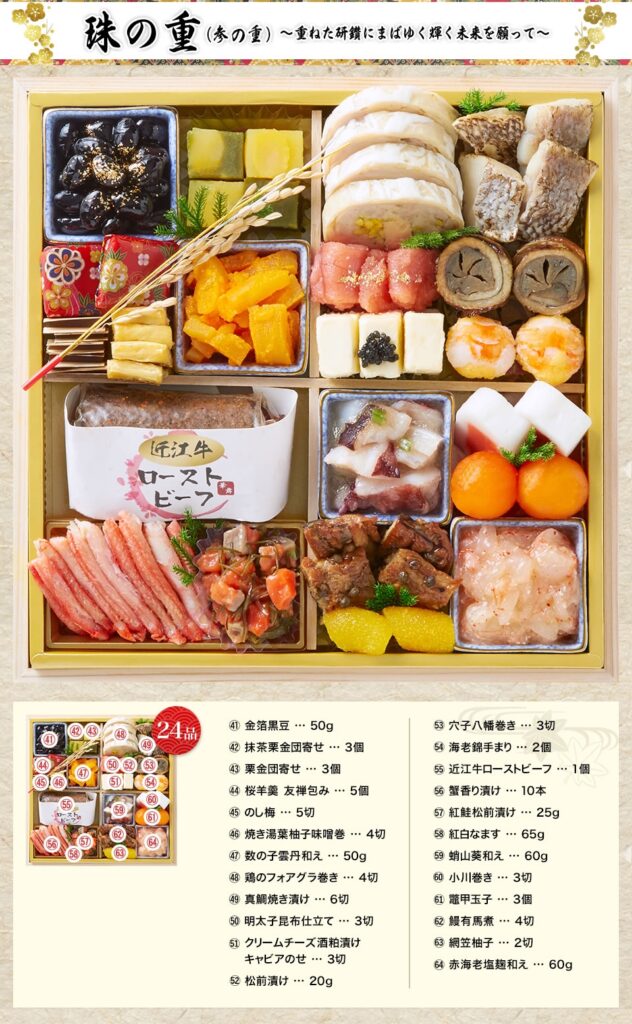 豪華さ、使い勝手、満足度の三拍子そろったのが「宝の舞」です。特大8.5寸・全64品のボリュームに、ロブスター・鮑・からすみ・近江牛といった“正月の主役”を余すことなく盛り込まれています。