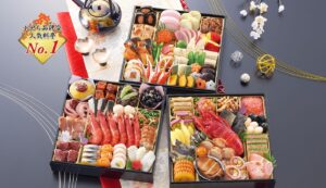 豪華さ、使い勝手、満足度の三拍子そろったのが「宝の舞」です。特大8.5寸・全64品のボリュームに、ロブスター・鮑・からすみ・近江牛といった“正月の主役”を余すことなく盛り込まれています。