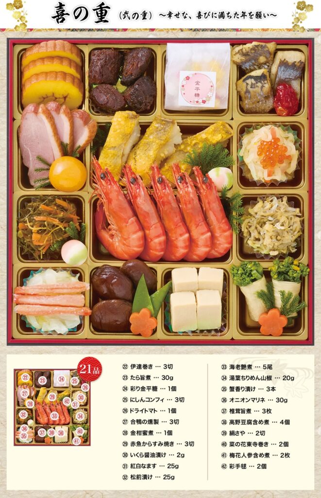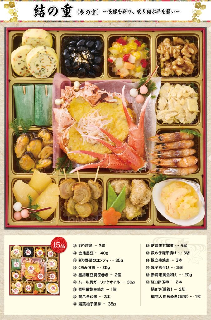| お重の内容 | 和洋、特大三段重、57品目(約5人前) |