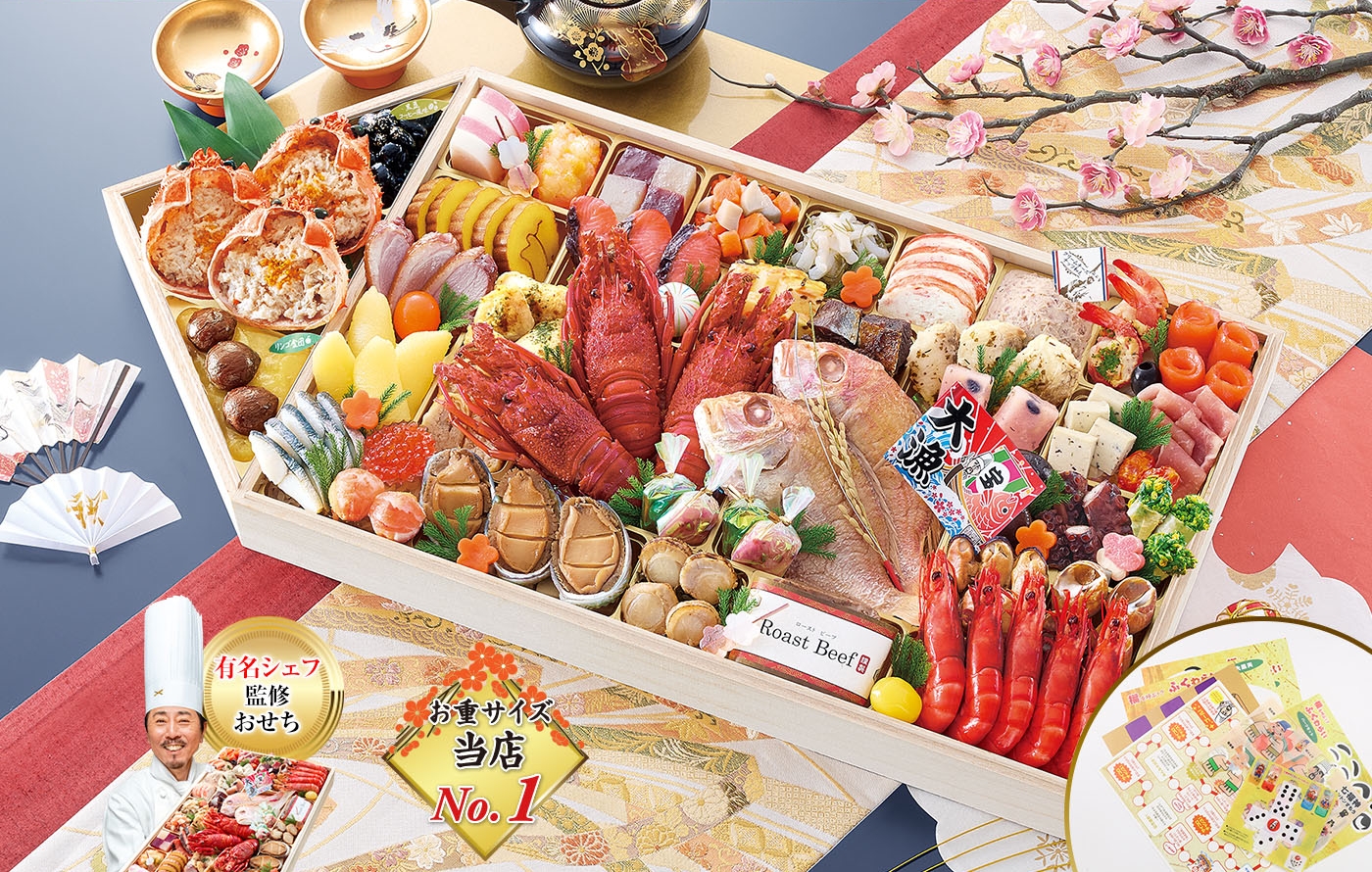 伝統の祝い肴に加えて、林流の創作が光る「黒豆コーヒー風味」や「リンゴ金団」もアクセントに。見た目の迫力と食べやすさを両立し、家族でワイワイ楽しめる内容のおせちです。