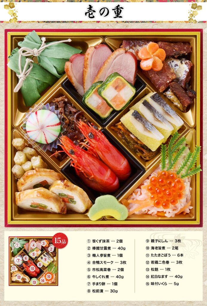 赤が映える「海老旨煮」を中心に、「親子にしん」や色柄の美しい「市松高菜巻」、仕上げの「味付いくら」で祝いの華やぎを整えます。