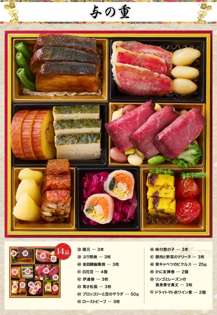 しっとり「ローストビーフ」を主役に、「金目鯛幽庵焼」「かに友禅巻」「味付数の子」で酒肴感とご馳走感を両立させています。