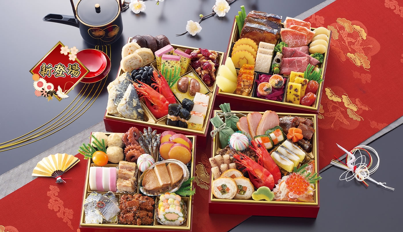 • 盛付済みの冷蔵おせち。解凍不要で当日そのまま出せる。