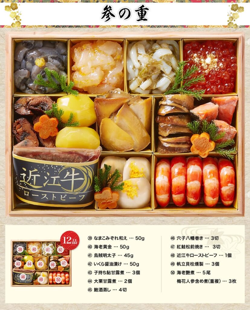 ここでは「冠寿」三段重の各お重の中身と実際に購入した方の口コミを紹介します。