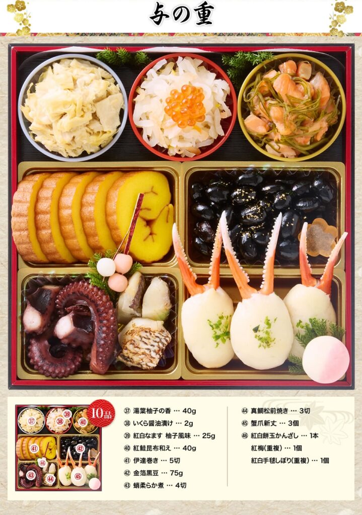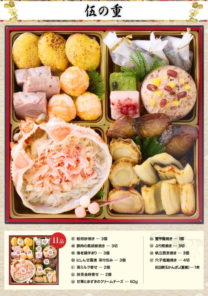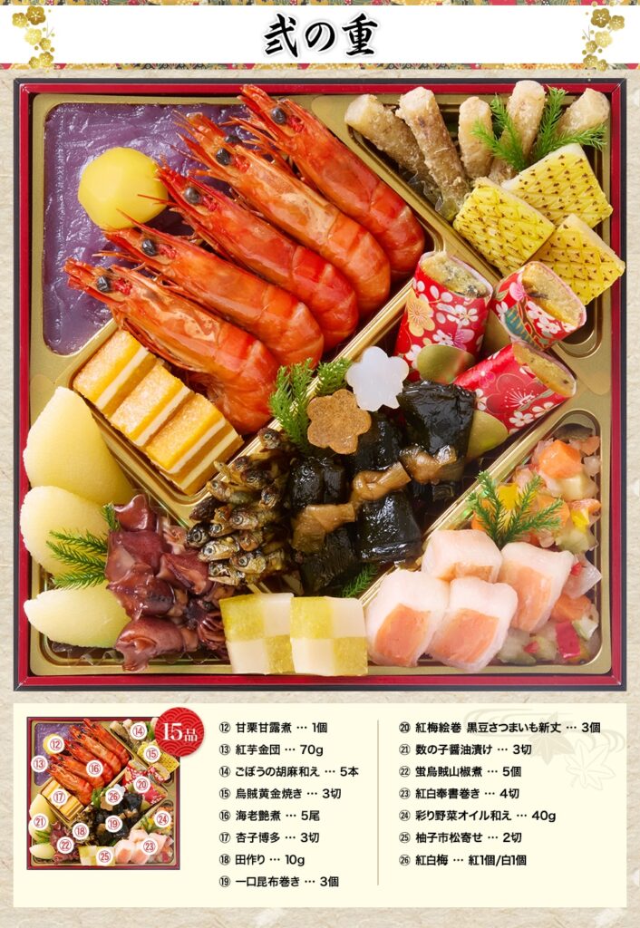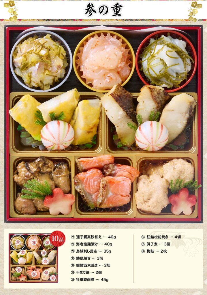 弐の重は有頭海老艶煮を主役に、数の子醤油漬け、一口昆布巻きなど縁起物で構成。また、魚介の香ばしさを楽しみたい方には、参の重の紅鮭松前焼き、銀鱈西京焼き、牡蠣時雨煮が圧巻です。