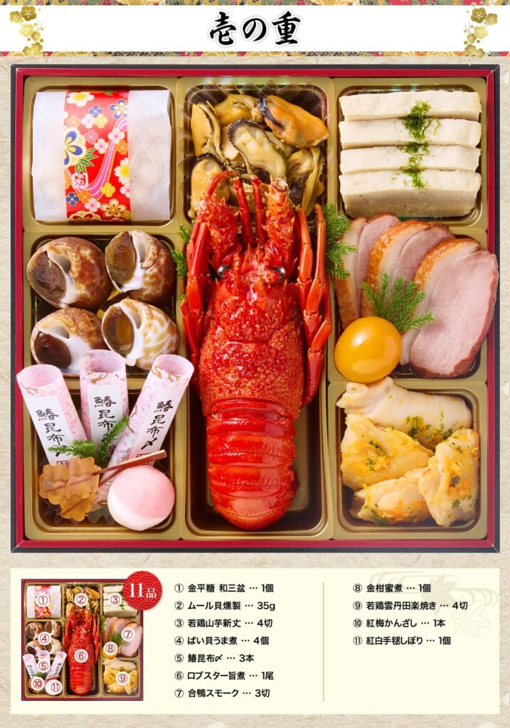 序盤はロブスターを中心に祝い肴で場が和み、中盤は焼き魚や肉料理の香ばしさで食卓が一体に。終盤は金目鯛や帆立、あわびの贅で高揚感をキープしつつ、黒豆や手毬菓子で柔らかく着地。
