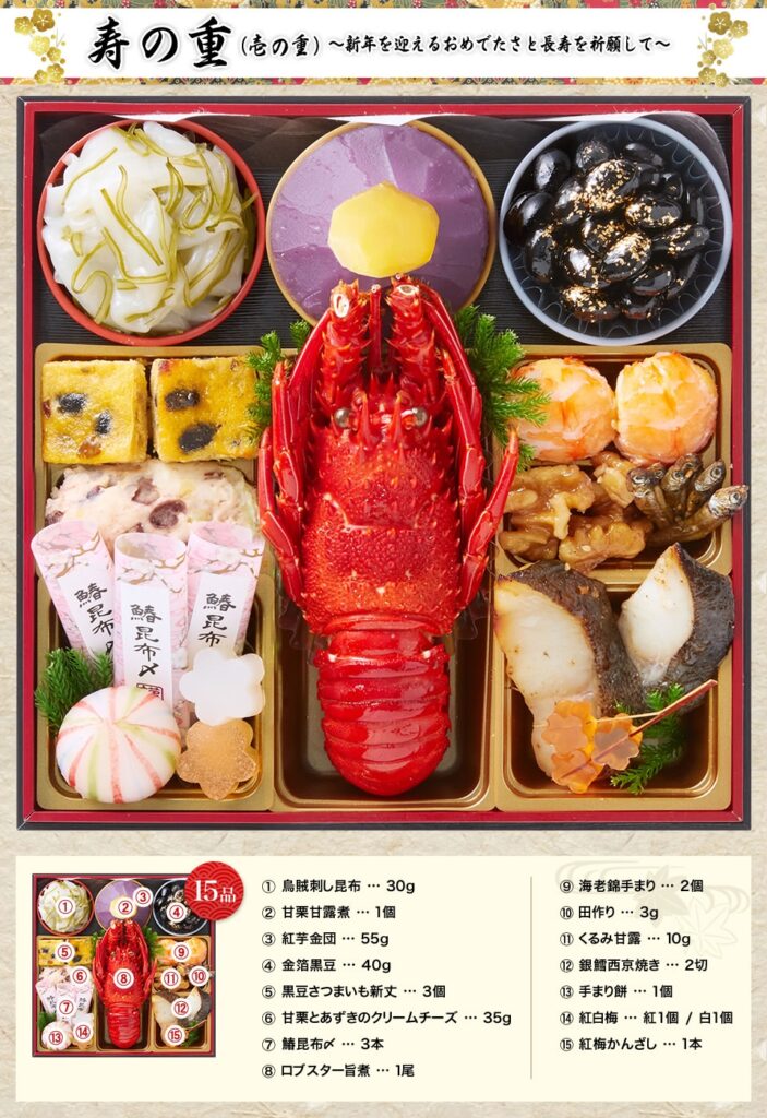 • 祝いの主役ロブスター旨煮、定番数の子で華やか。