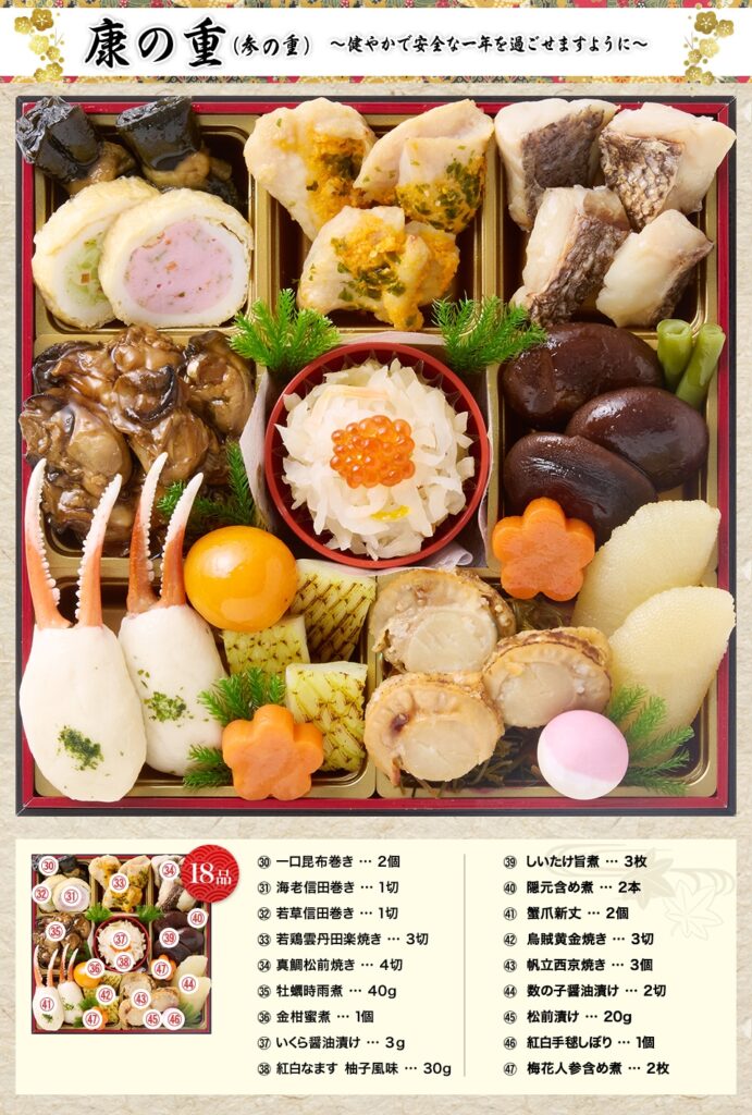 お重の内容和風、6.5寸三段重、47品目(約3〜4人前)
