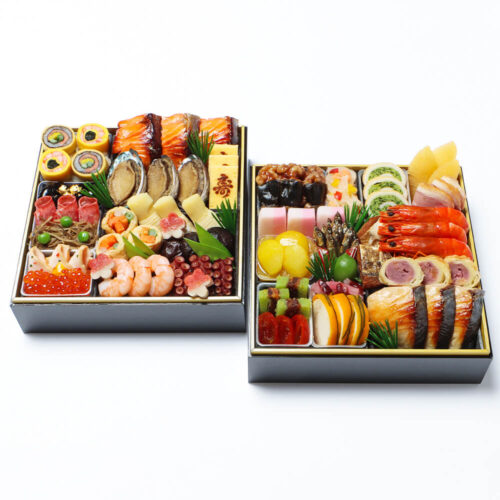 和洋料亭おせち二段重は、京料理の繊細なだしと洋の遊び心を合わせた、三世代で楽しめる京都おせち。壱の重には、ぷりっと旨み濃い海老艶煮、香ばしい鰆柚庵焼、しっとり合鴨ロース、ほくほく甘い栗きんとん、こっくり胡桃甘露煮、縁起の祝い数の子、やわらかな棒鱈旨煮、爽やかな華やかマリネ、柚子柿グリーンサンドや紫芋リンゴパイまで彩り豊かに詰め込みました。弐の重にも焼き物や酢の物、チーズ寄せなどが続き、料亭らしい奥行きある味わいが広がります。洛東の静けさを思わせる上品な仕立てで、新年の食卓を華やかに整えてくれる一品。冷蔵で届くので、出来立ての風味のまま新年の席へどうぞ。