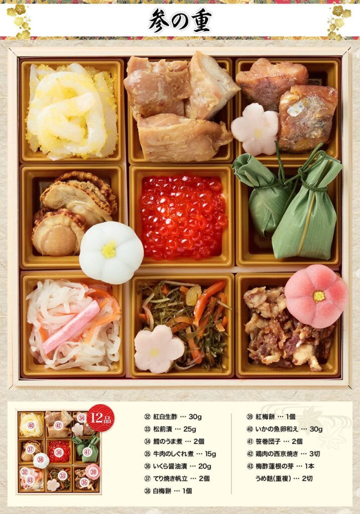 お重の内容 | 和風、三段重、43品目(約3〜4人前) |