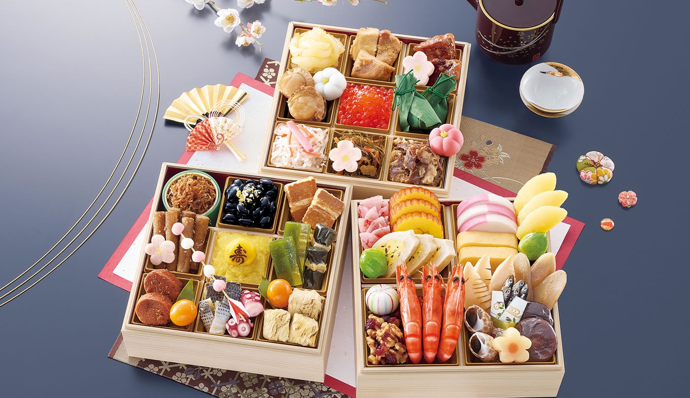 - 縁起物「黒豆ふくませ」「昆布巻」「数の子」などを京風に整え、飽きの来ない味付け。
