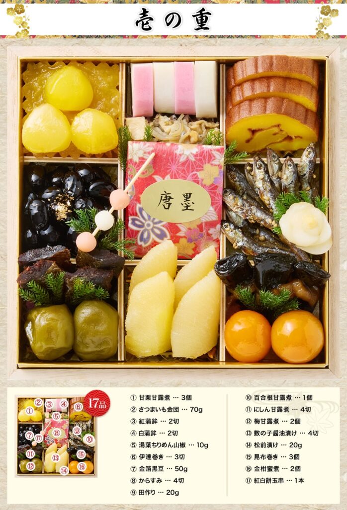 祝い肴を中心に、黄金色の「からすみ」を堂々と据え、「数の子薄醤油漬け」で歯ざわりと旨みを添えます。艶やかな「金箔黒豆」と、ふんわり甘い「伊達巻き」が晴れの趣を整え、年始の食卓に端正なコントラストを生み出します。