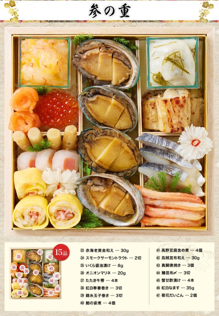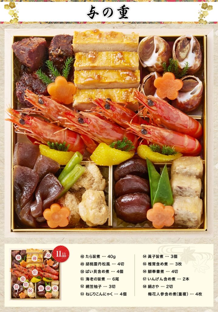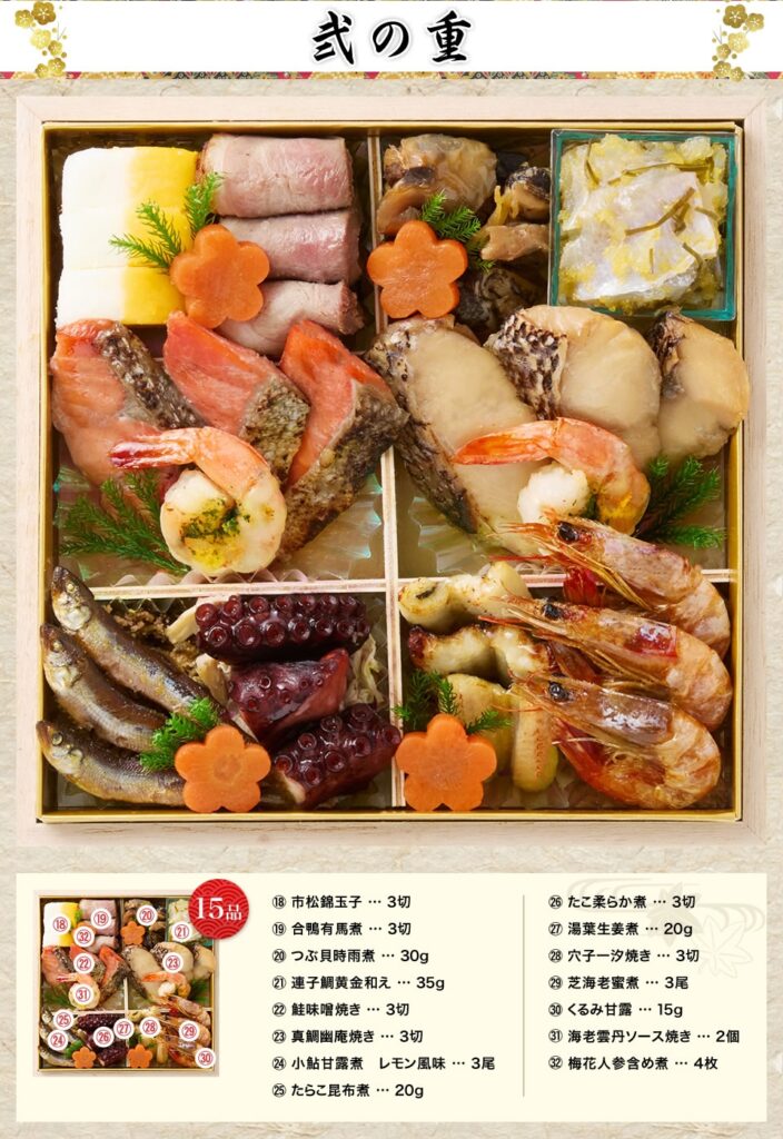 正統の四段構成にのっとり、壱=祝い肴、弐=焼き物、参=酢の物、与=煮物と役割を明確にし、しかも要所に「からすみ」「鮑の姿煮」「真鯛俵焼き」「海老の旨煮」といった主役級を配置、一家団欒で食べ進めたときの満足感が抜群。