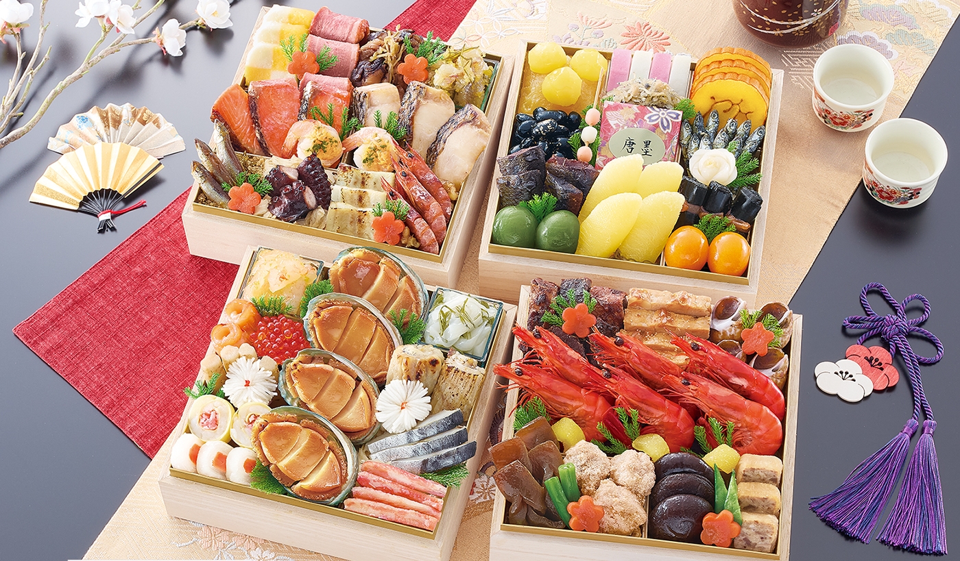 正統の四段構成にのっとり、壱=祝い肴、弐=焼き物、参=酢の物、与=煮物と役割を明確にし、しかも要所に「からすみ」「鮑の姿煮」「真鯛俵焼き」「海老の旨煮」といった主役級を配置、一家団欒で食べ進めたときの満足感が抜群。