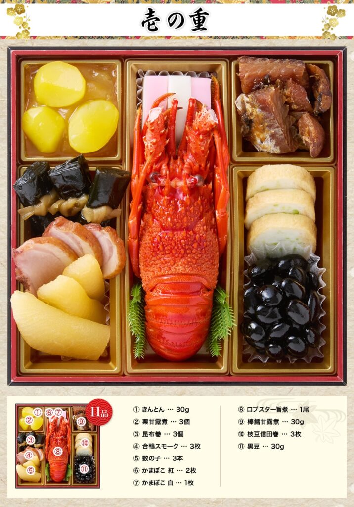 中央に「ロブスター旨煮」を据え、艶やかな「黒豆」とぷちぷちの「数の子」で晴れの趣を整える。香りよい「合鴨スモーク」や品よく甘い「栗甘露煮」、きりりと締まる「昆布巻」が脇を固め、祝い肴の王道を端正にまとめ上げる段。
