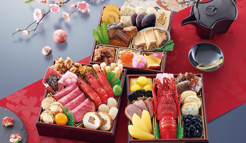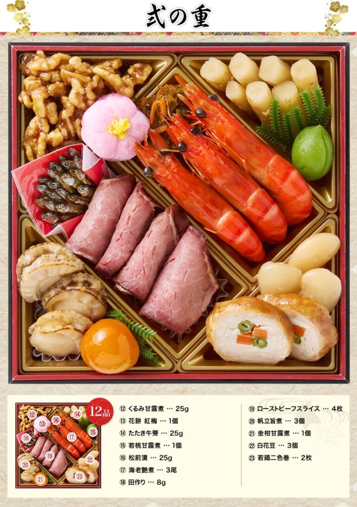祝いの席を射止める「ロブスター旨煮」、ふっくらと煮含めた「アワビ旨煮」、旨みを閉じ込めた「ローストビーフスライス」が三段の要。