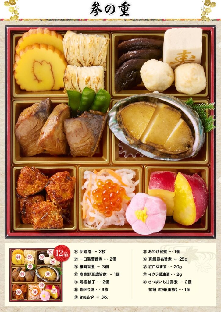 お重の内容 | 和風、三段重、35品目(約3人前) |