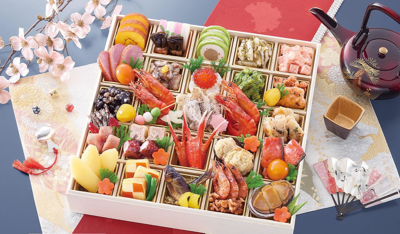 伝統の祝い肴もきちんと押さえつつ、25仕切りの格子で味が混ざらない配慮。冷蔵・盛付済みで、届いた瞬間から彩りの良さと香りが食卓を明るくし、酒肴としても箸が進む構成に。