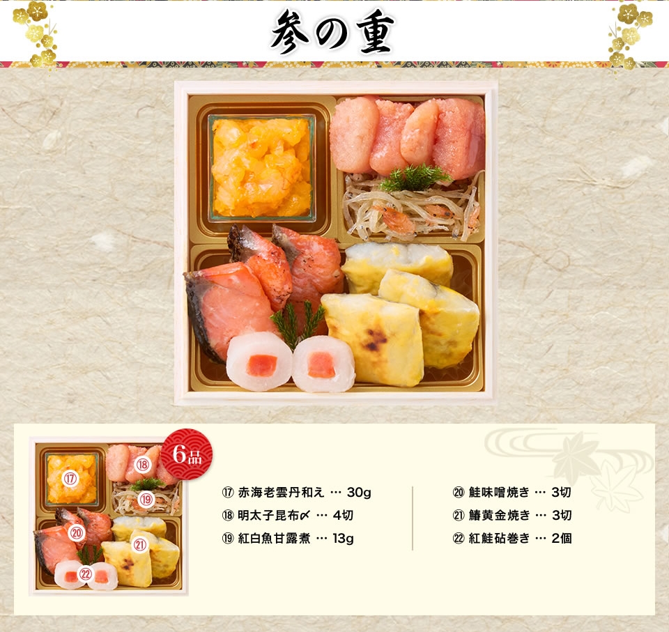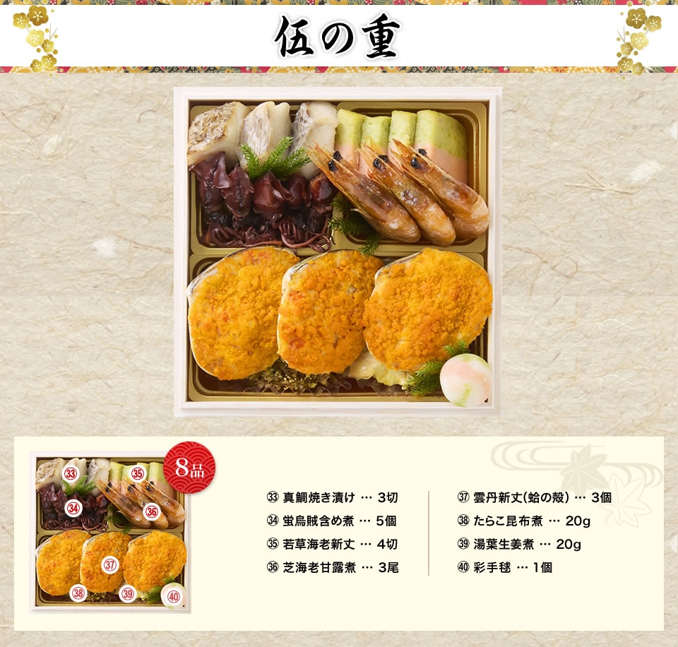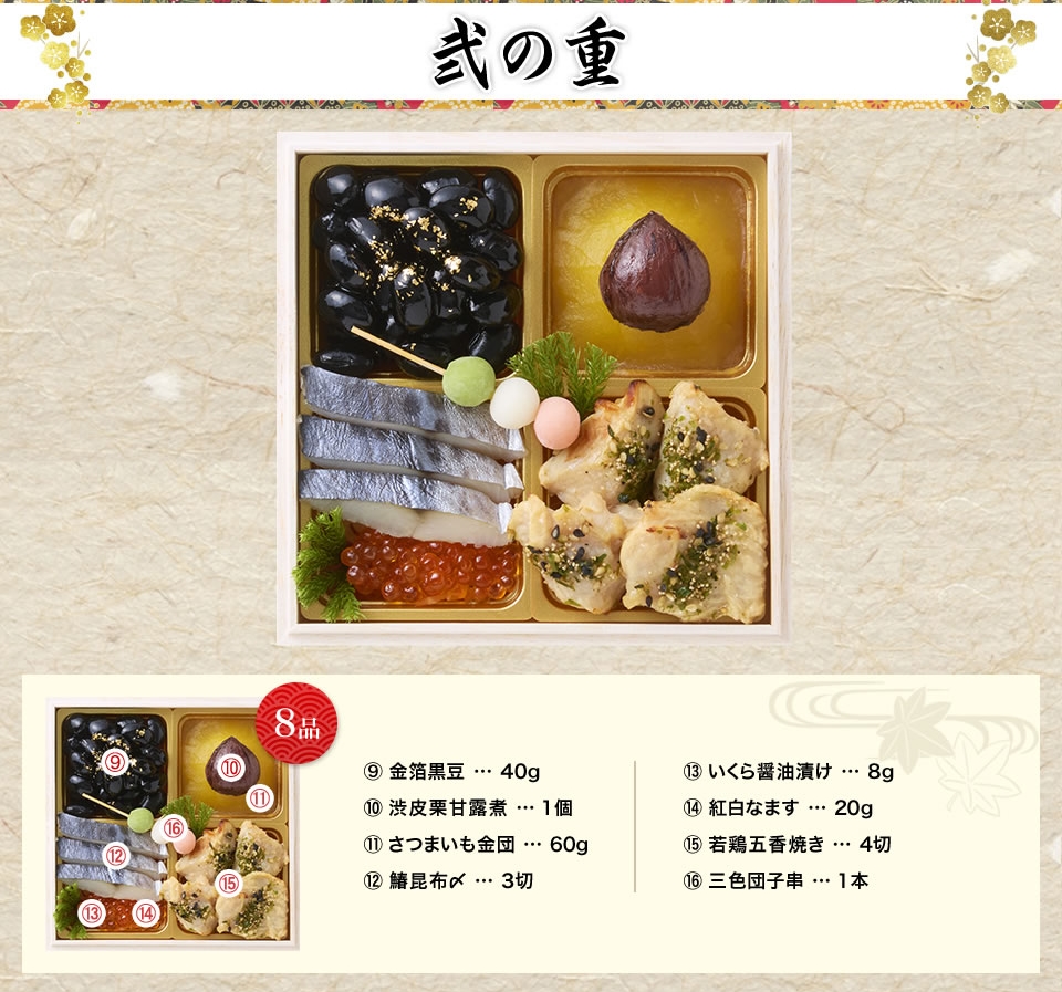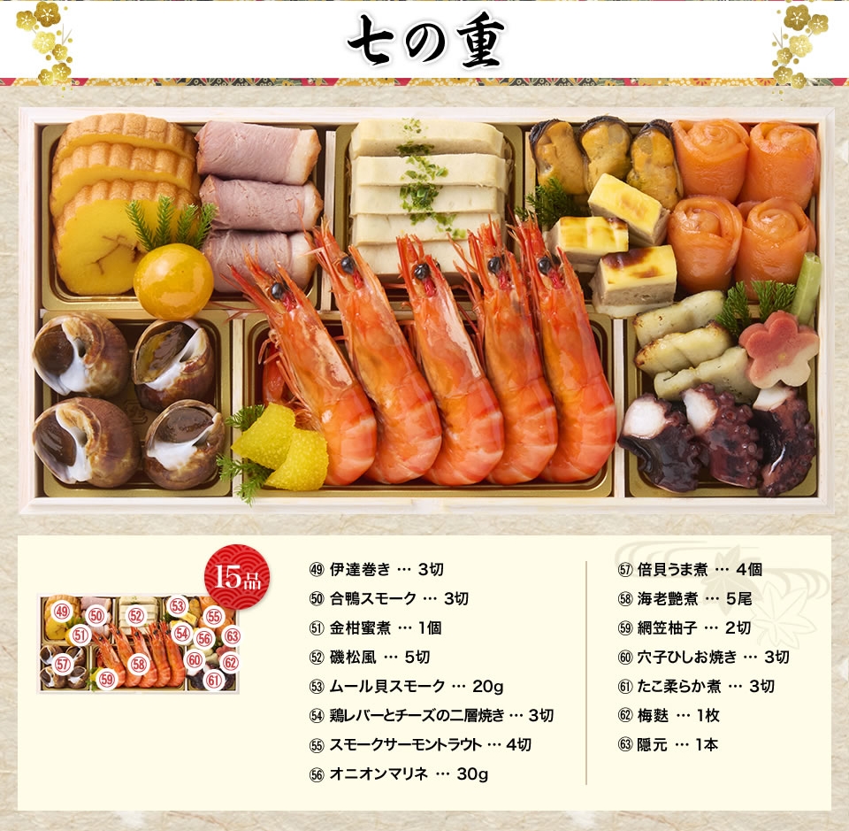 お重の内容 | 和洋折衷、七箱与段重、63品目(約4〜5人前) |
