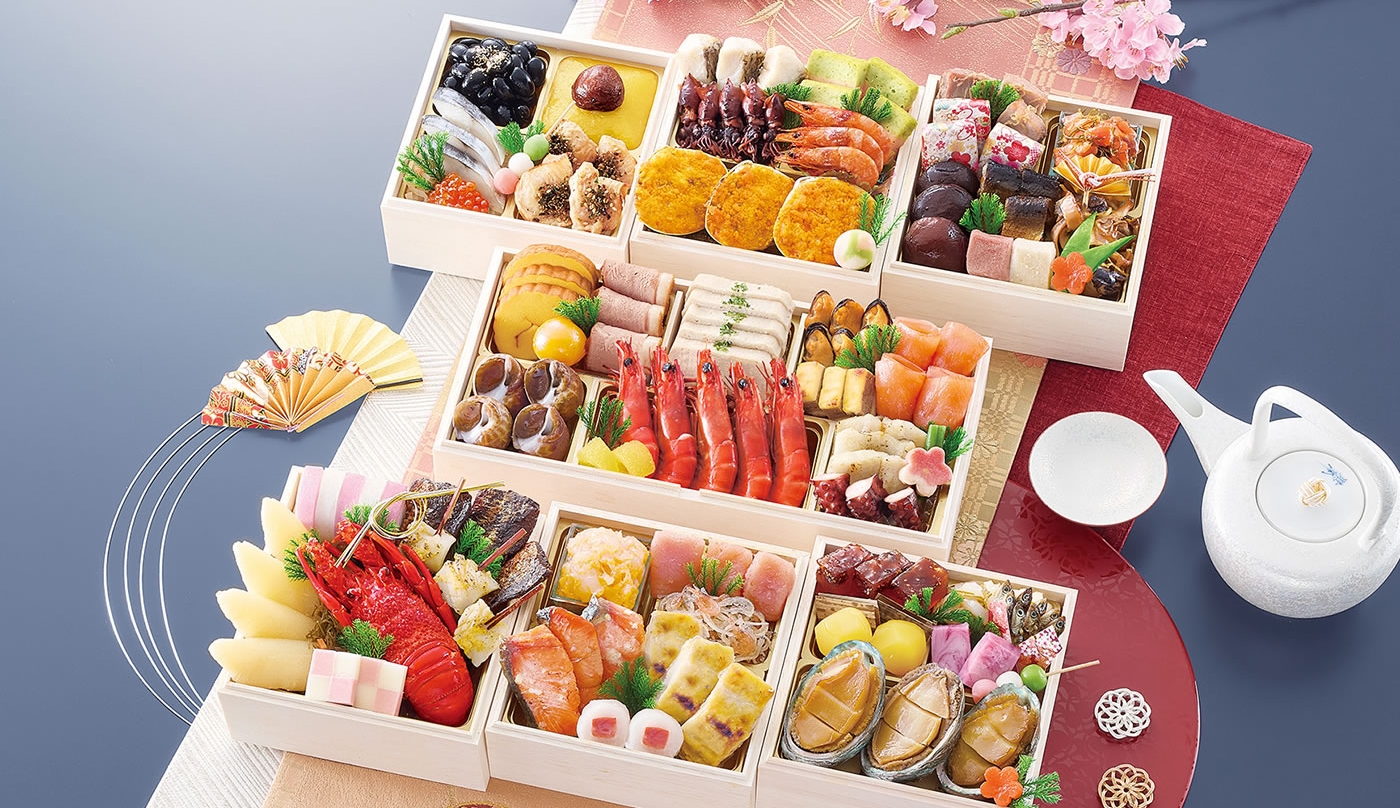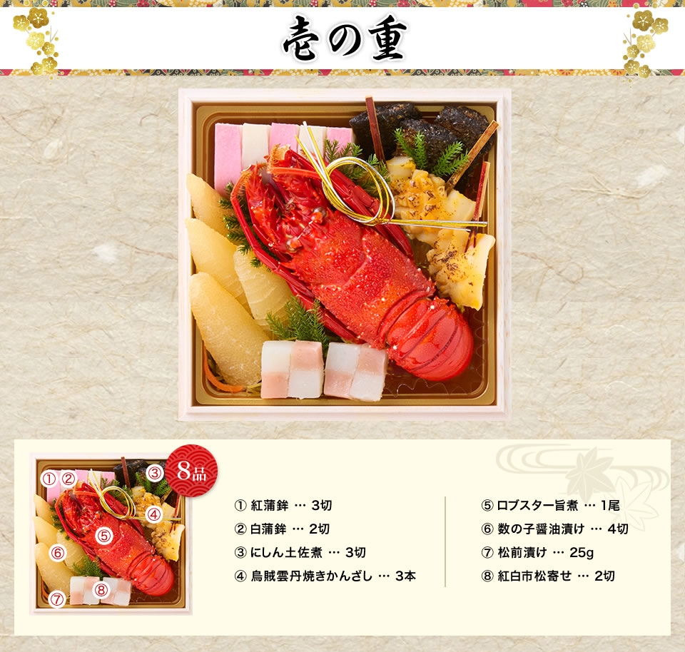 - 「ロブスター旨煮」「あわび福良煮」「雲丹新丈」「海老艶煮」など豪華食材が各箱の主役に。