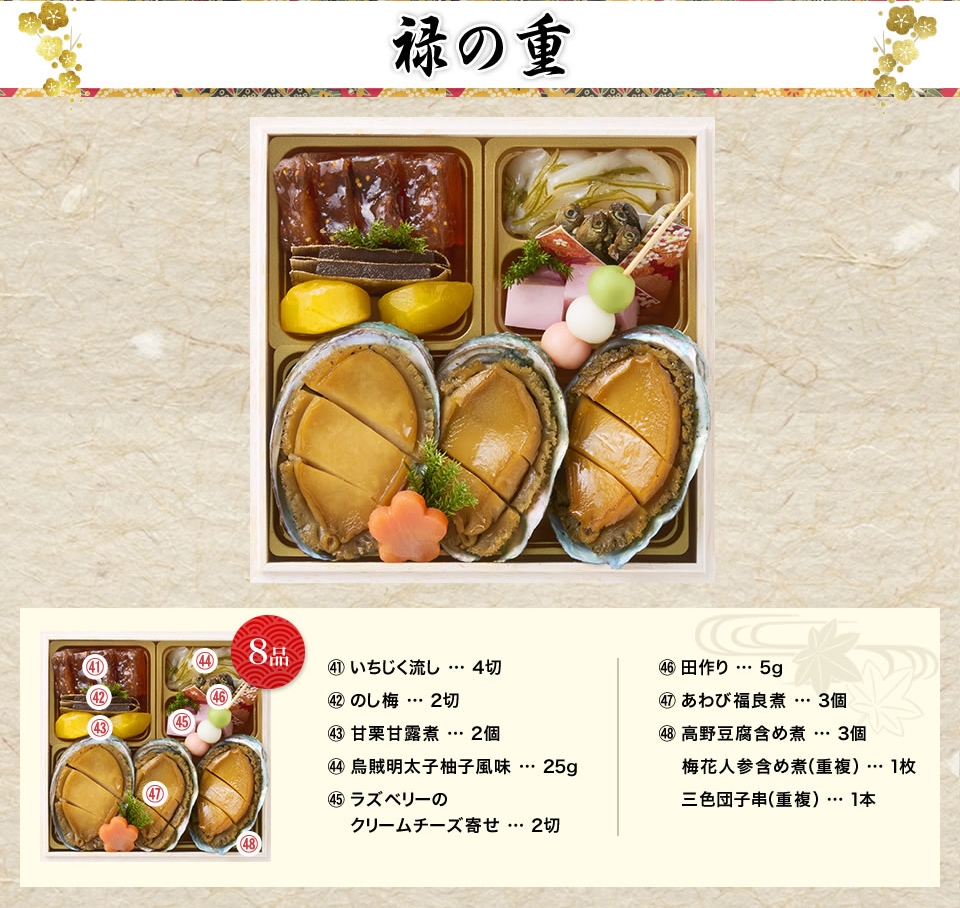 迫力の「あわび福良煮」を三つ据え、「のし梅」や「甘栗甘露煮」でめでたさを重ねます。「烏賊明太子柚子風味」や「高野豆腐含め煮」も添え、味わいに奥行きを出しています。