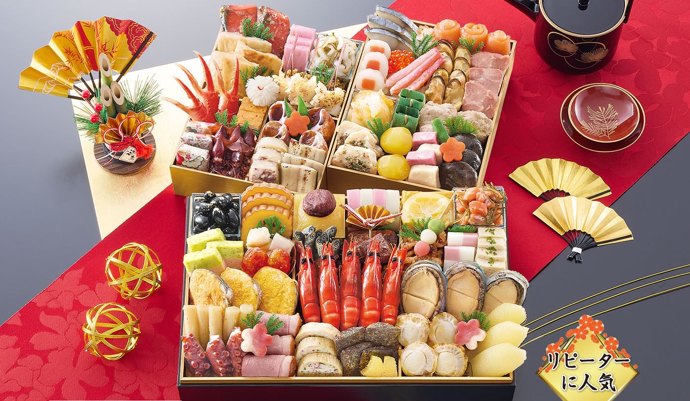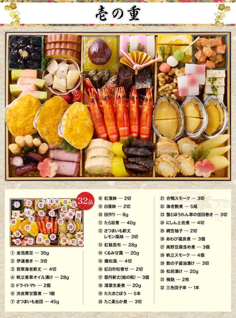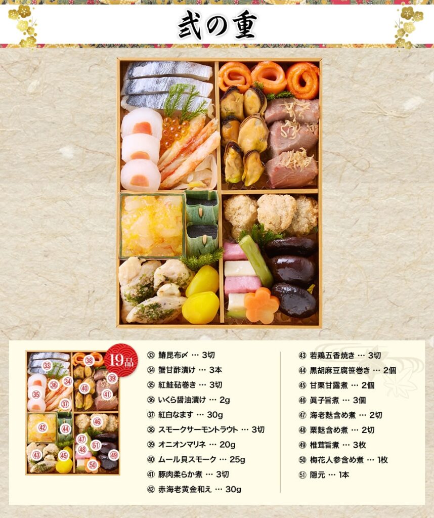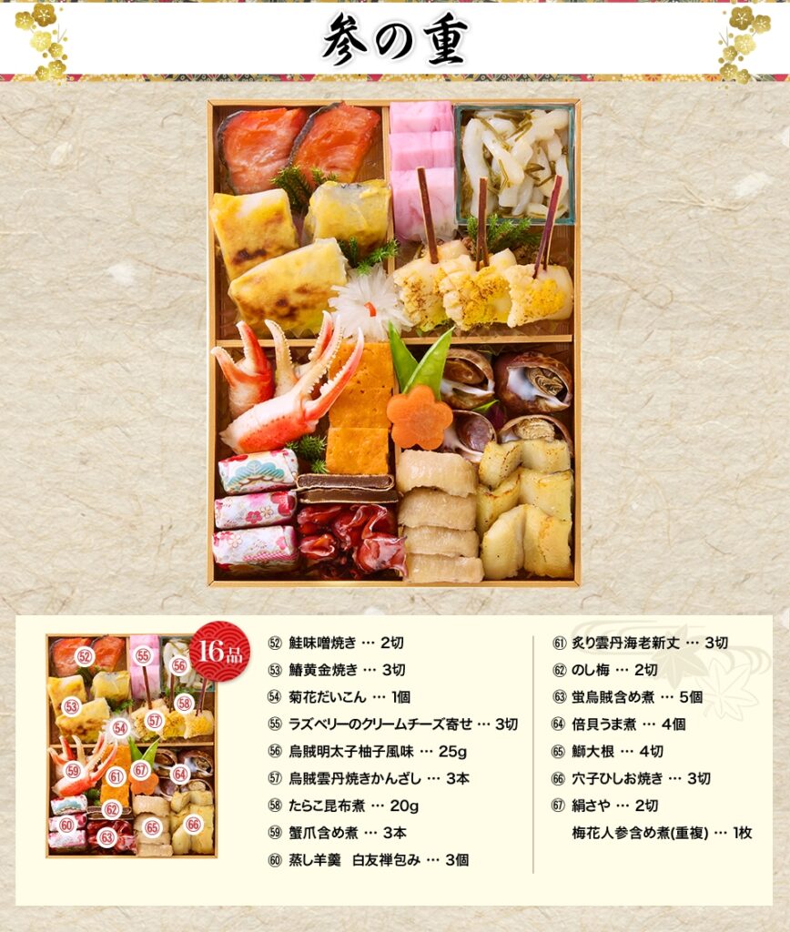 - 67品・約4人前の充実構成。伝統の祝い肴から焼き物、オードブル系まで網羅。